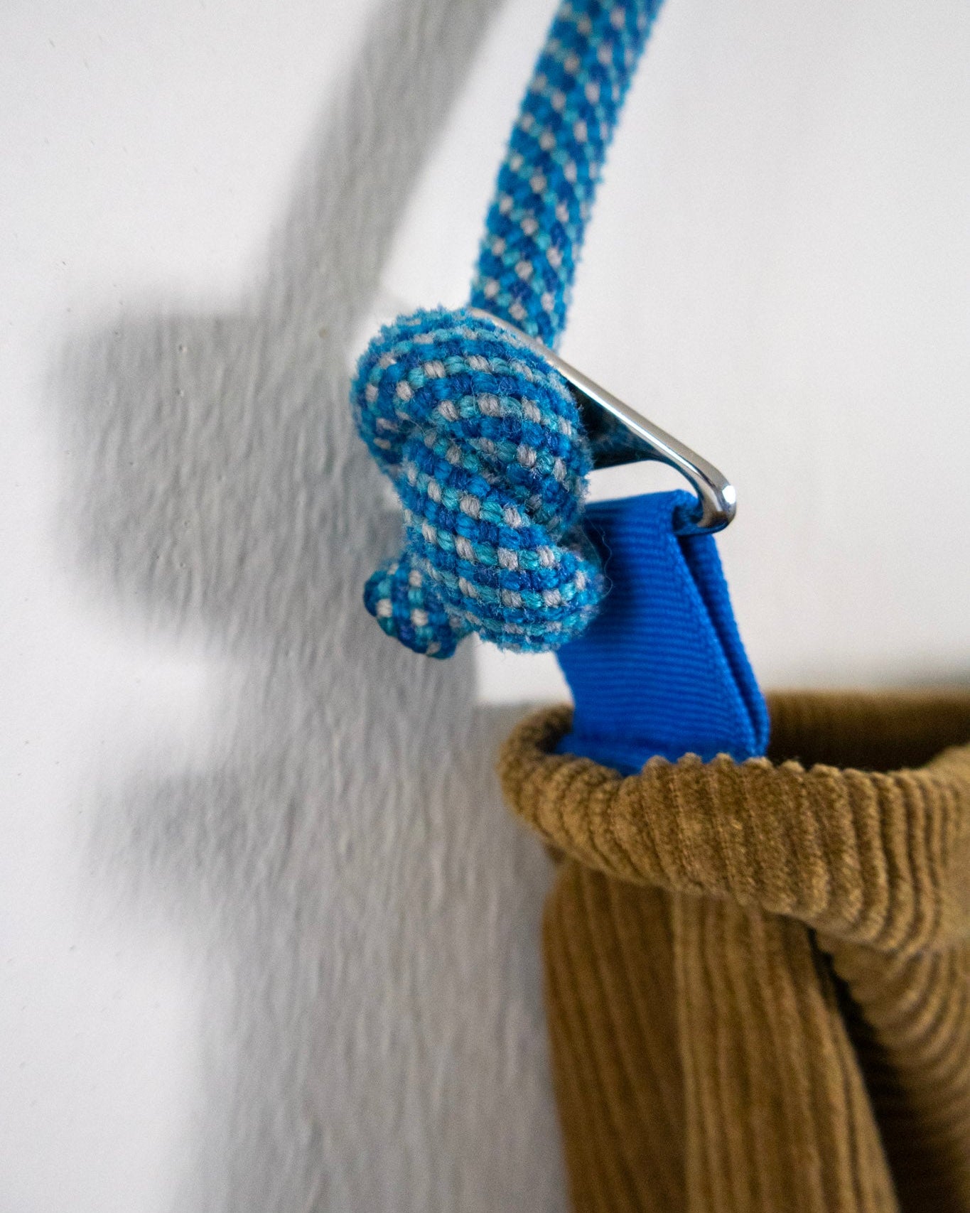 Posture® Bungee Messenger Bag. Made for The Theo Show by Casper Jonze repurposing corduroy fabric from our walking pant and wool from our lavender sweater. Exterior and interior pocket, co-branded woven label. Edition of 1.